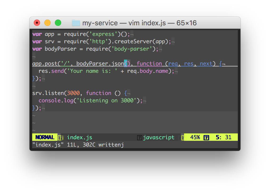 In another instance of the terminal, try POSTing some data with the curl utility (you can also learn more about curl).