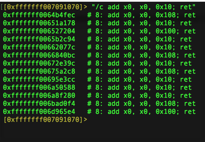"/c add x0, x0, 0x10; ret"You should get an output like this: - We are going to take the second address at the top(in this example it's