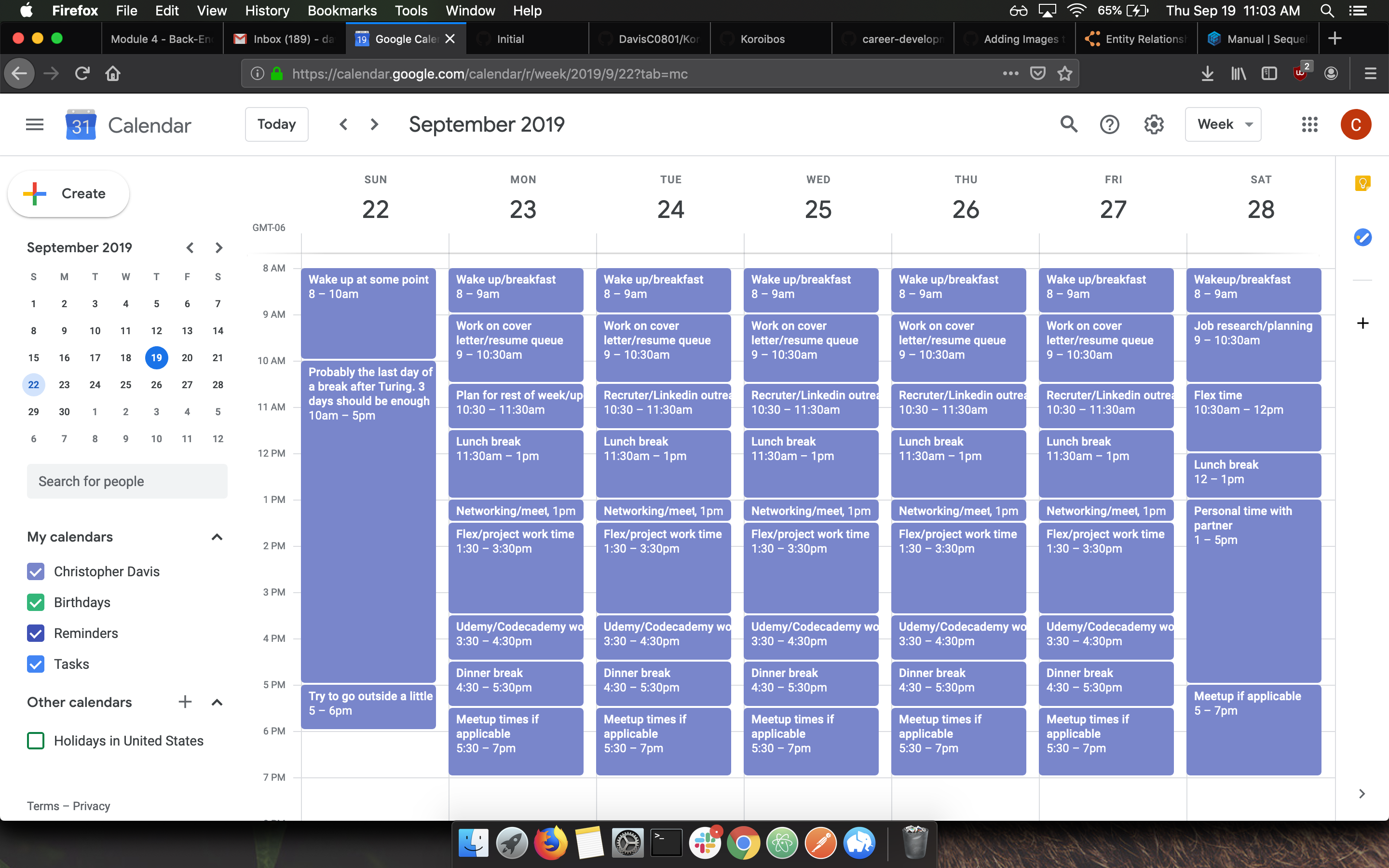 The following is my calander snapshot. It's optimistic and the times might be flexable, but it's pretty close to how I want to spend my time once I start job hunting seriously.