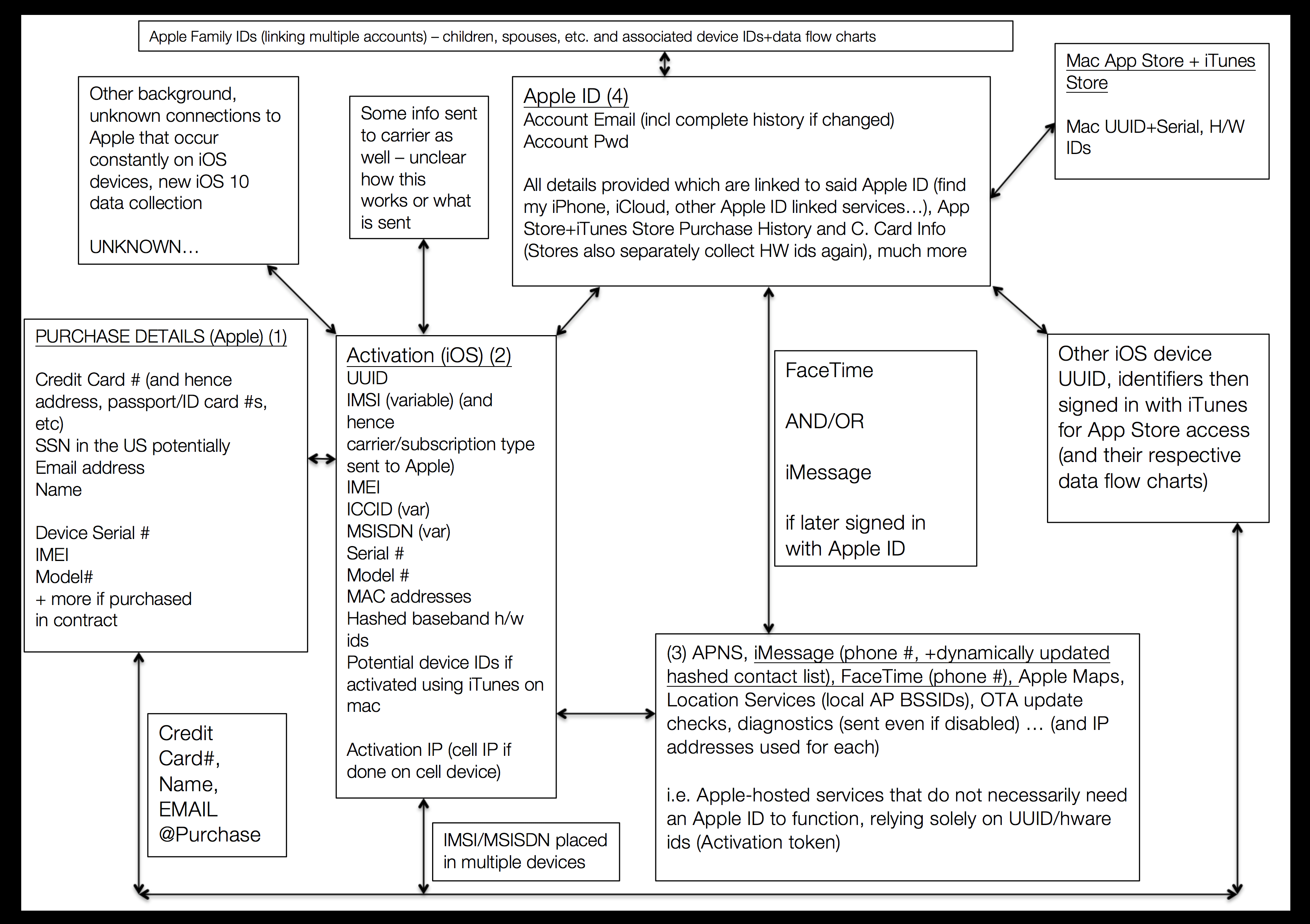 This UUID registration is subsequently used as a unique identifier for Apple’s iOS-integrated Apple Push Notification System (APNS) (another privacy nightmare), FaceTime, Siri, iMessage and other Apple-hosted services. Apple may argue that they only receive hashes of these identifiers, but if you examine any proof of purchase for an iOS device, it will become clear that Apple links the credit card used at purchase, the purchaser's name and email, and of course, the serial number and all components required to generate a UUID. So, in essence, iOS devices (and also all IP addresses used with said device), unless purchased from a third party with cash, will always be linked to real identities, especially with cellular devices, since Apple will receive the IMSI/MSISDN every time a new SIM is inserted in the device.