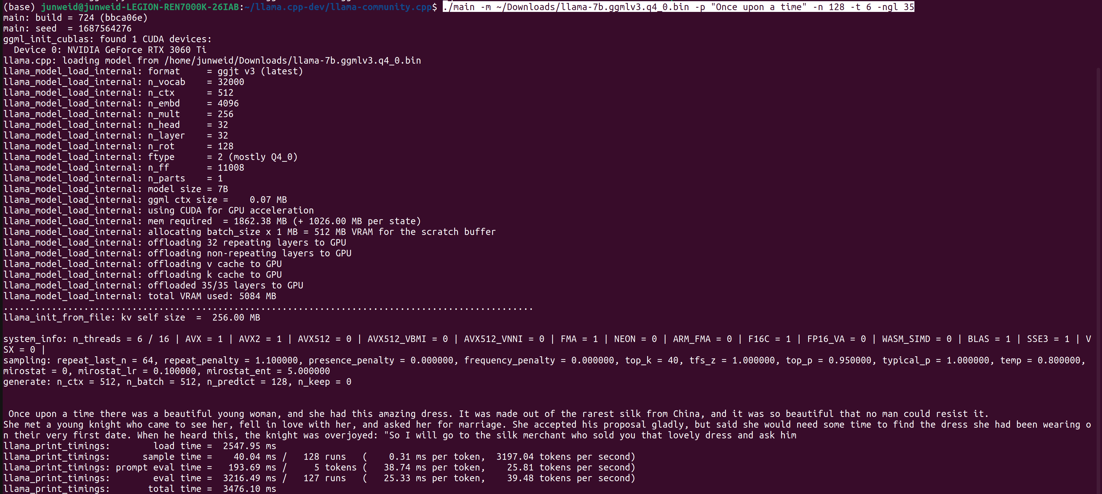 Step 5: ./main -m ~/Downloads/llama-7b.ggmlv3.q4_0.bin -p "Once upon a time" -n 128 -t 6 -ngl 35. Here a critical parameter is -ngl which states how many layers are "offloaded" to GPU. So that some GPU w/o enough VMem could also work.