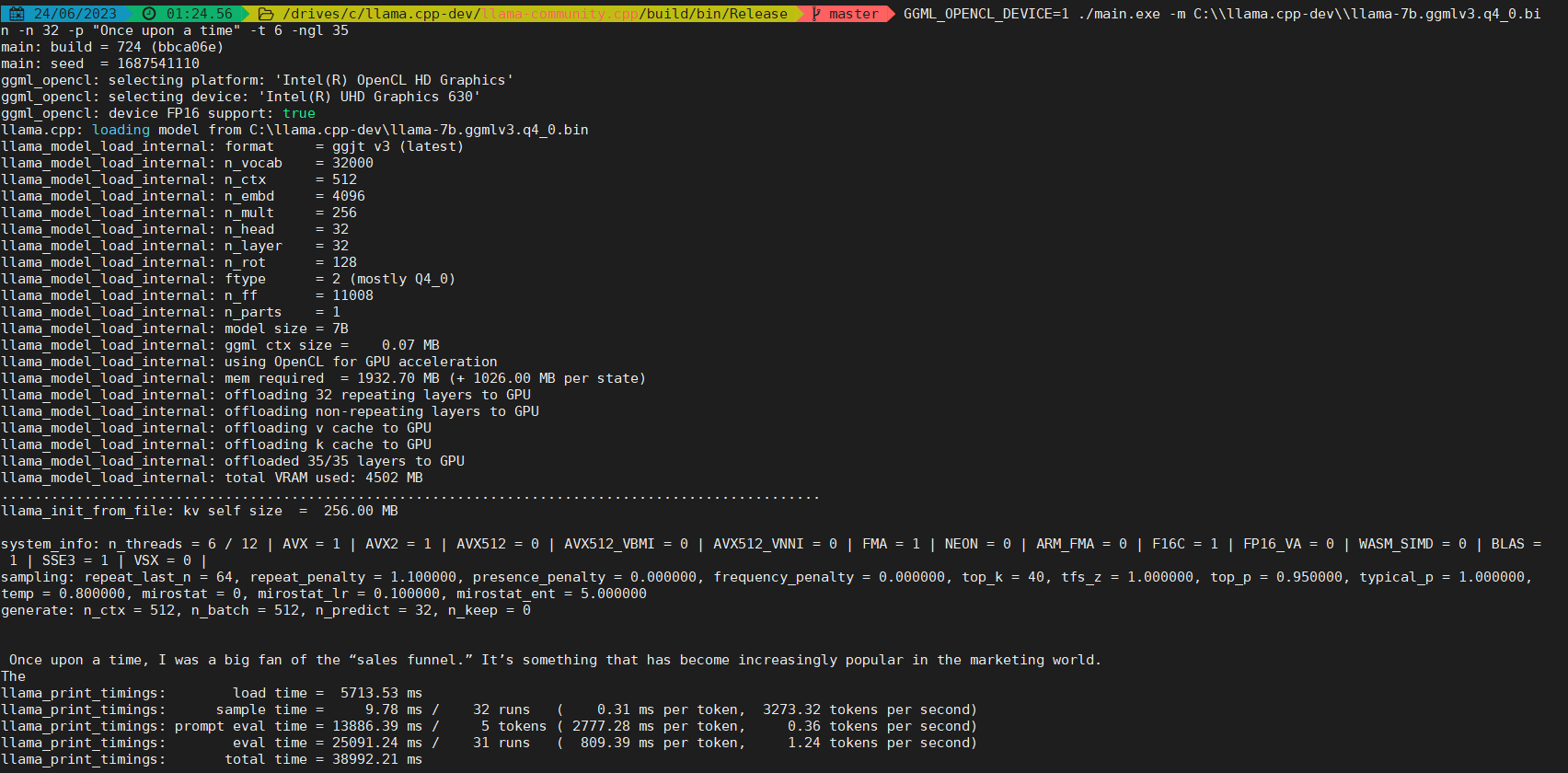 Step 8: GGML_OPENCL_DEVICE=1 ./main.exe -m C:\\llama.cpp-dev\\llama-7b.ggmlv3.q4_0.bin -n 128 -p "Once upon a time" -t 6 -ngl 35 Here a critical parameter is -ngl which states how many layers are "offloaded" to GPU. So that some GPU w/o enough VMem could also work. On my laptop, 2 devices support OpenCL and the intel igpu is the second one, so we need to set GGML_OPENCL_DEVICE=1