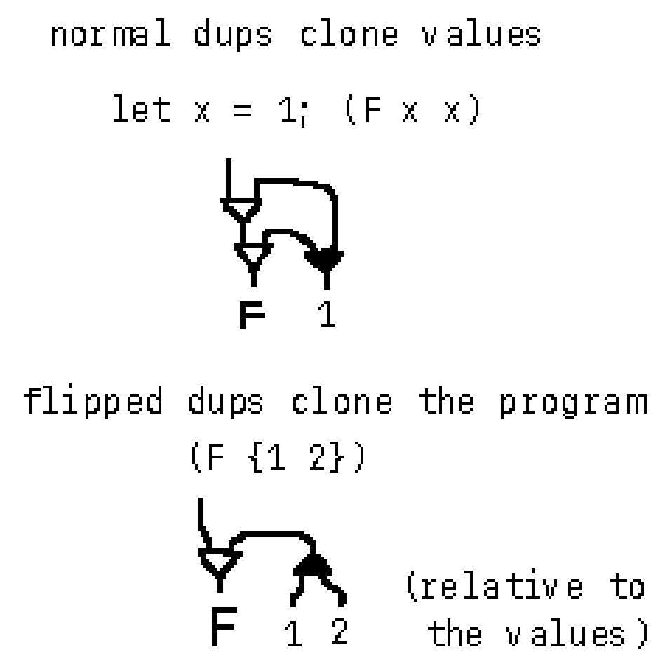 Interaction Nets are a new model of computation capable of evaluating lambdas optimally. HVM is a practical implementation of that system. Since INets are fully linear, variables must be "cloned" via "dup-nodes", which can be seen as "lazy cloners". Usually, these can only be linked to variables, and are "invisible" to the user. But what happens if we expose dup nodes as a first-class feature of the user-facing language?