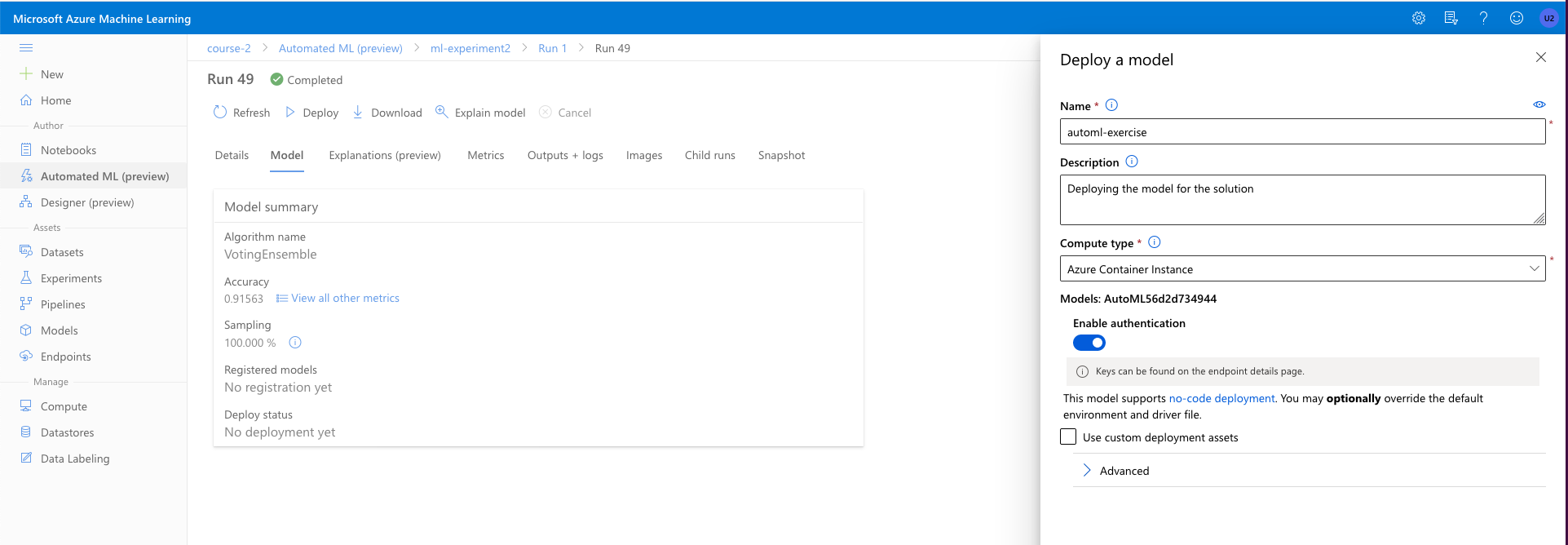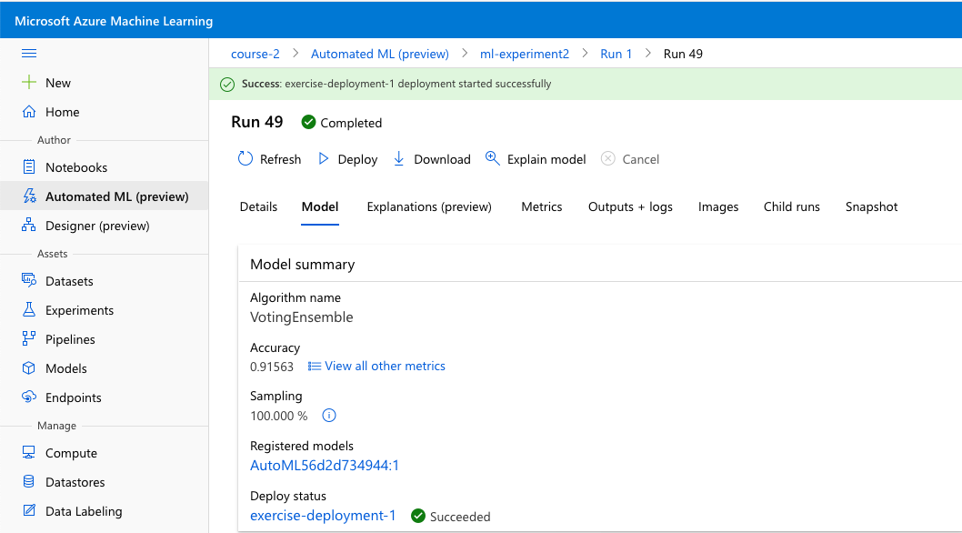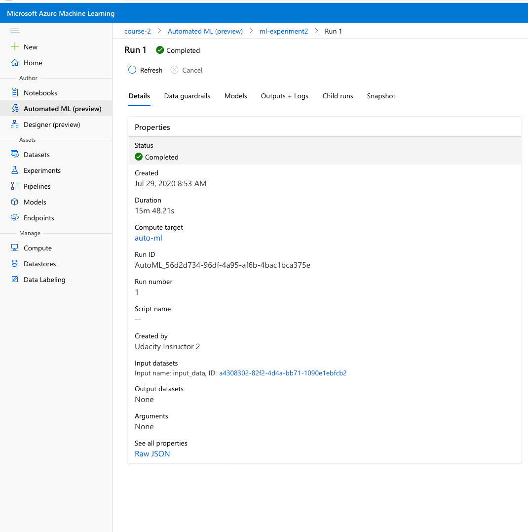 - Go to the Automated ML section and find the recent experiment with a completed status. Click on it.