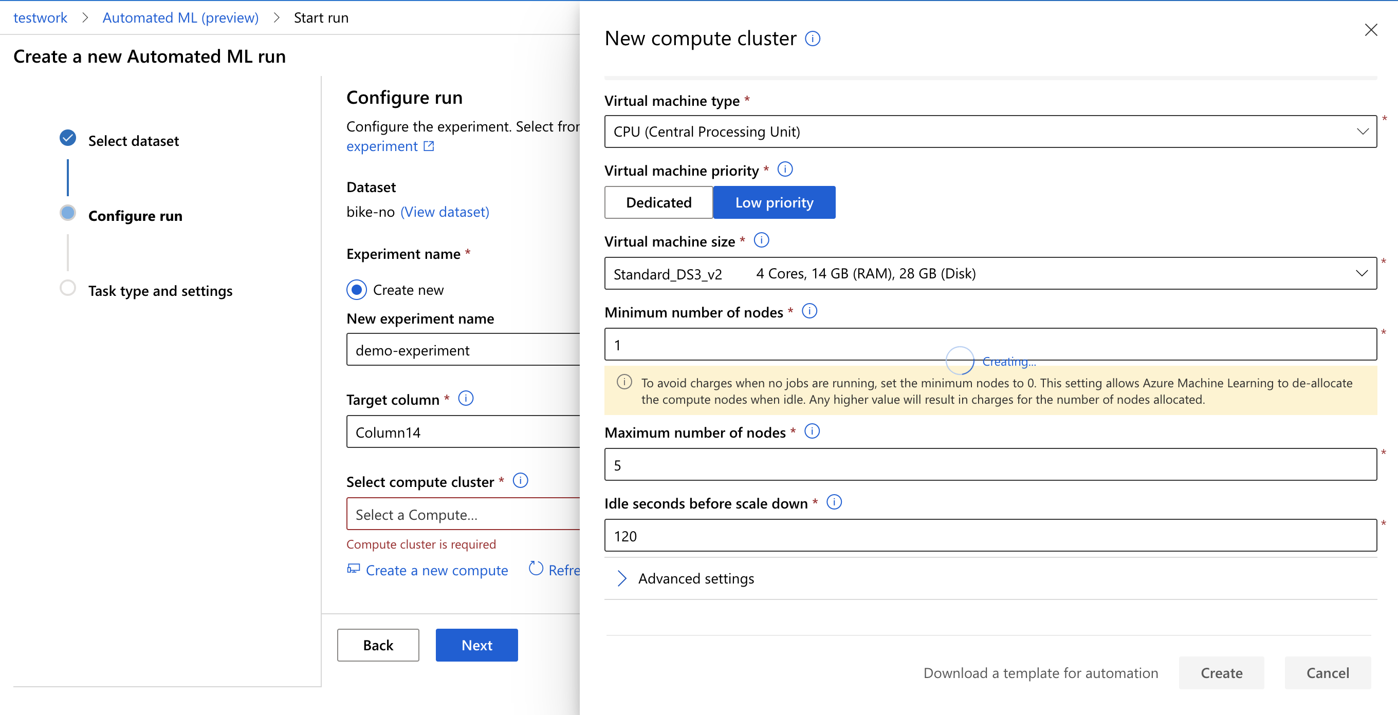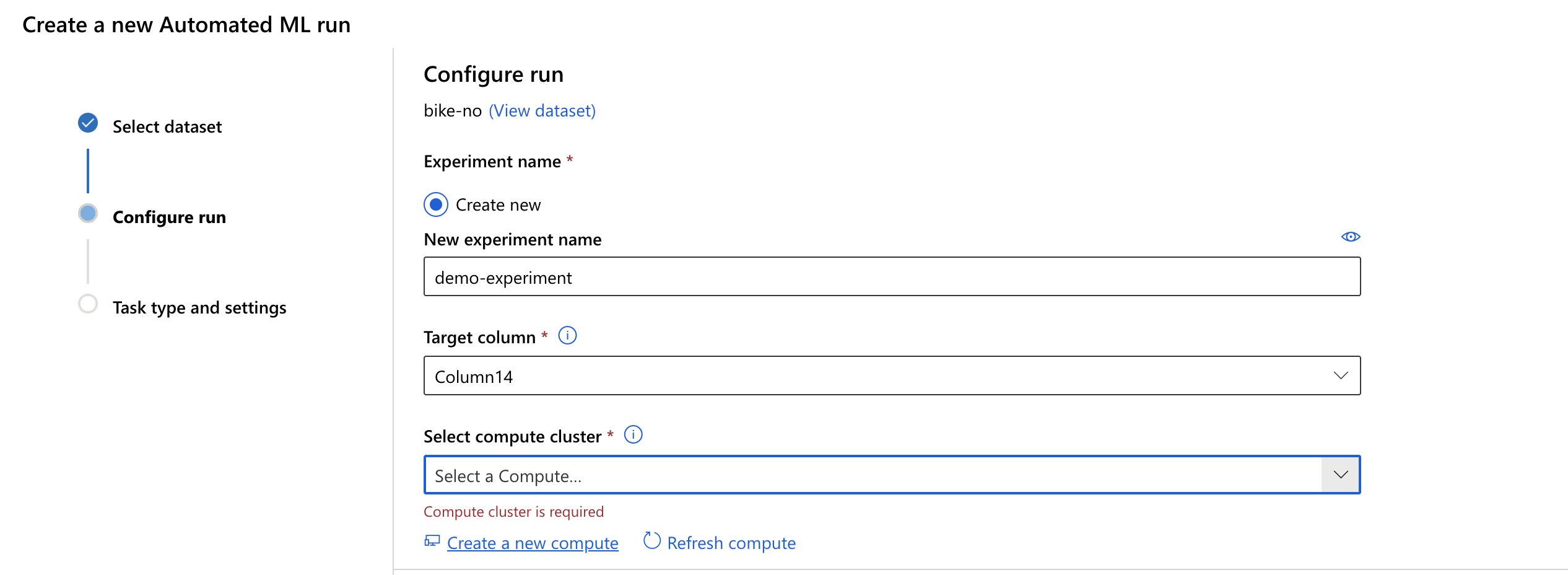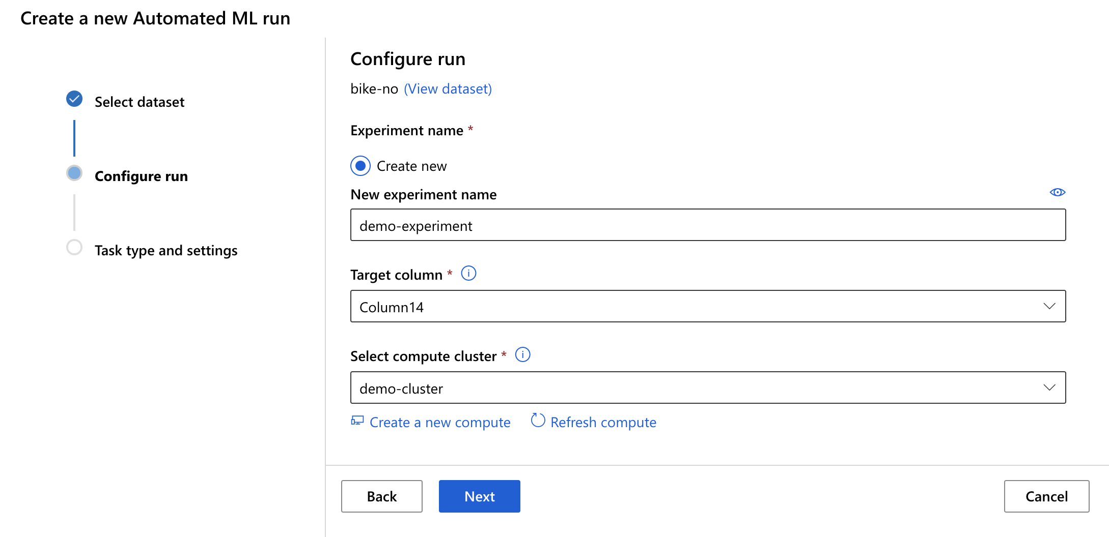 - Once the new compute cluster is successfully created, use this cluster to run the autoML experiment. Make sure you fill the name and target column.