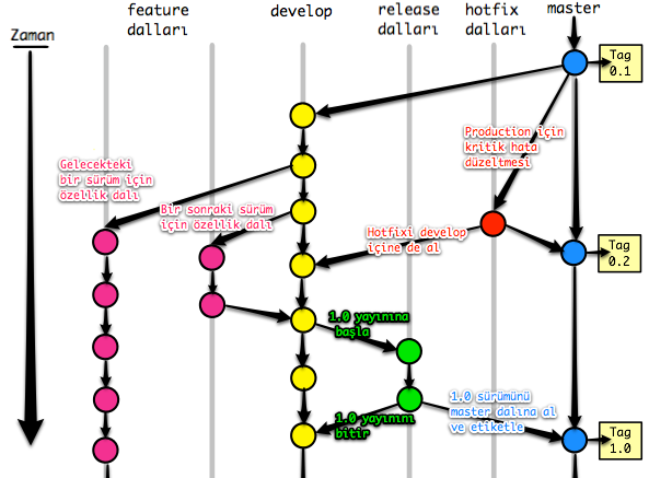 Git-flow modeline göre her projenin çalışan yayına hazır versiyonu master branch olmalıdır ve sadece develop branch den merge edilmelidir.(Acil durumlarda hotfix ten de edilebilir)