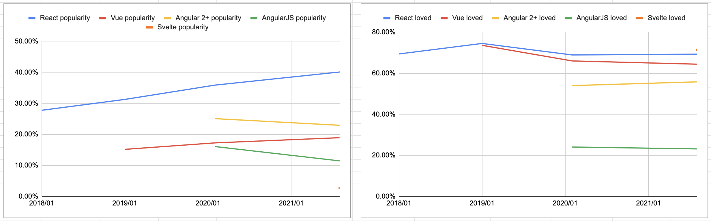 - Loved: Svelte 71.47%, React.js 69.28%, Vue.js 64.41%, Angular 55.82%, Angular.js 23.18%