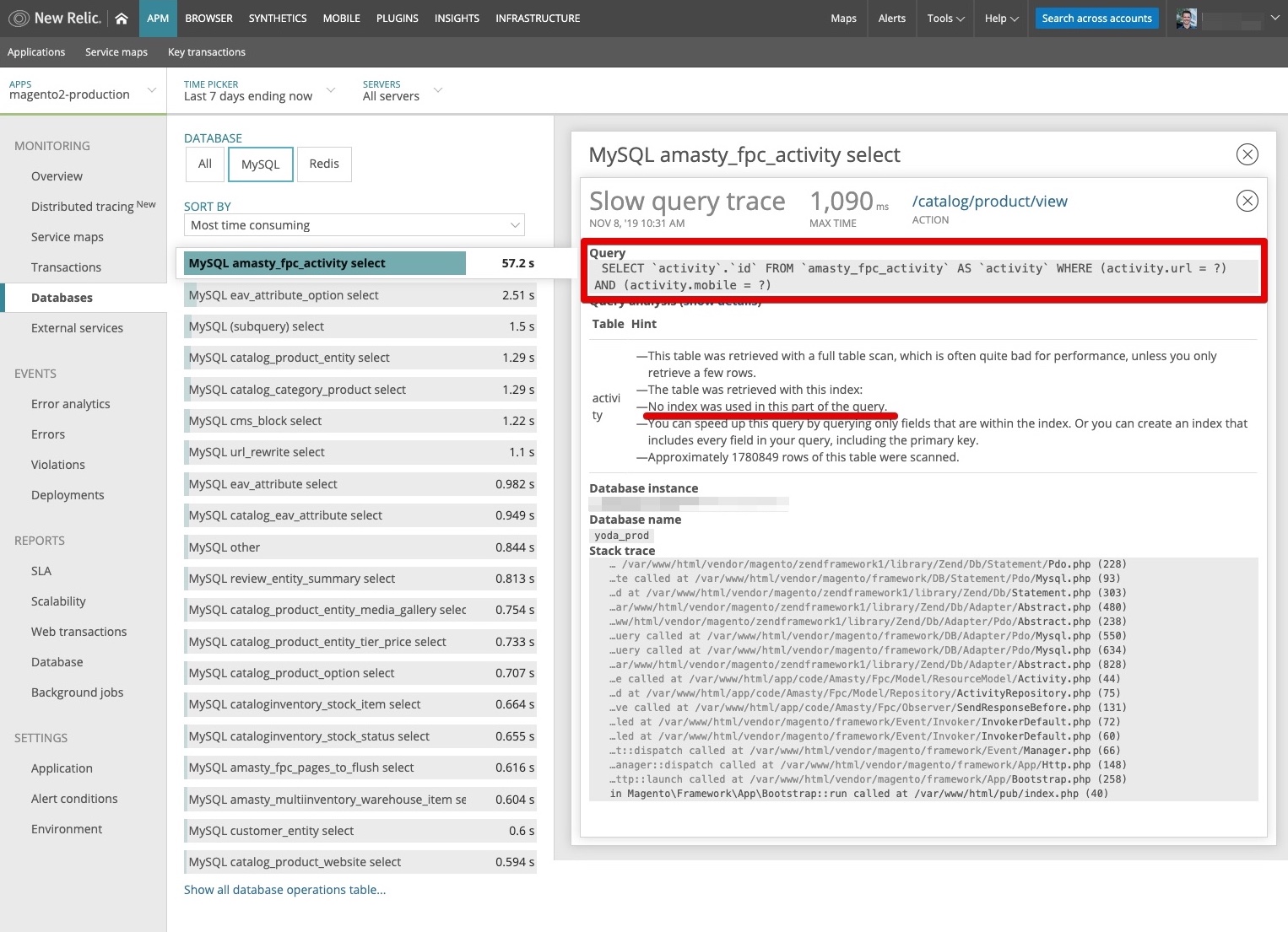 Description: The query generated by the \Amasty\Fpc\Model\ResourceModel\Activity::matchUrl method runs a query on a table that is missing an index.