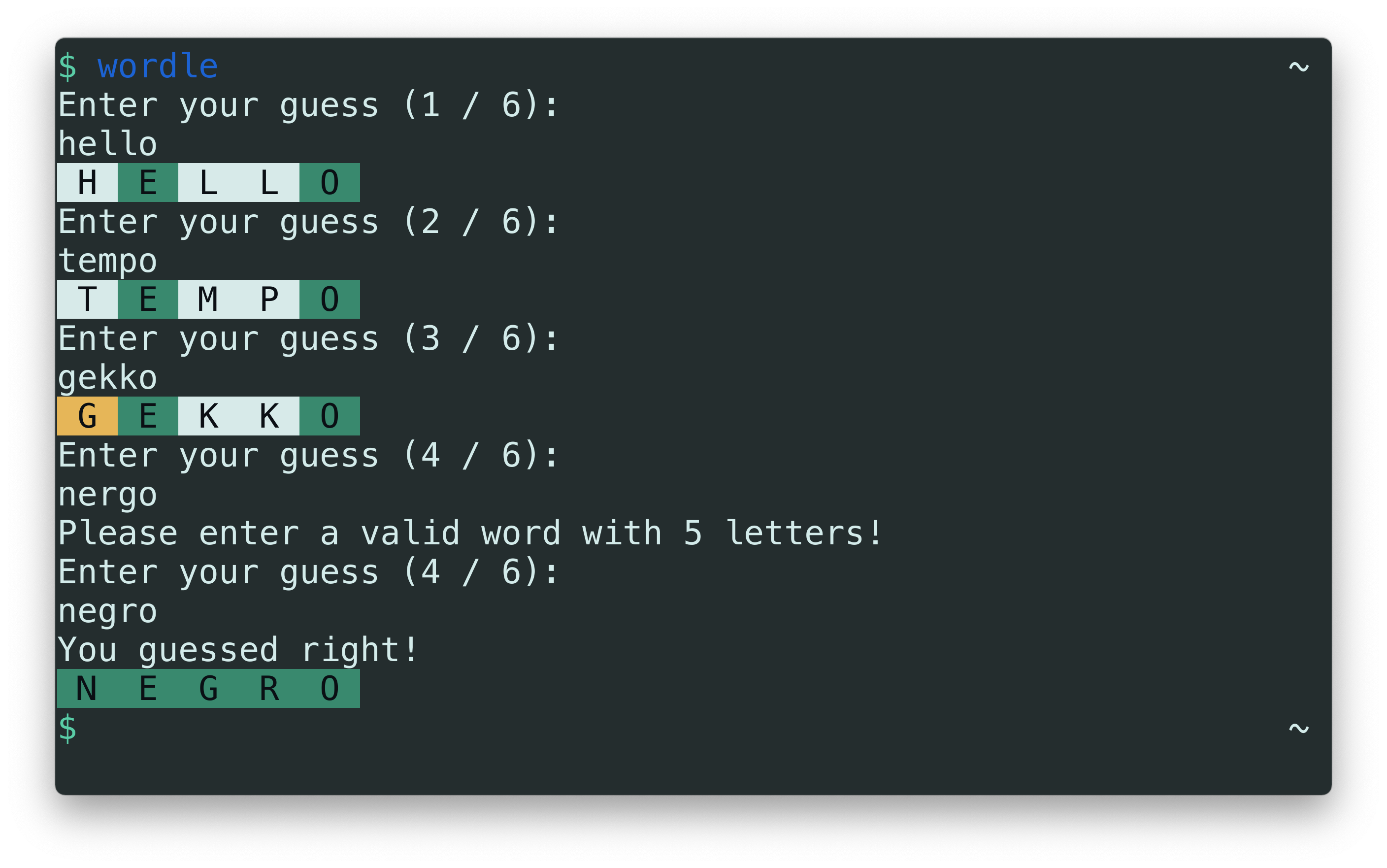 + [[ ${#guess} != 5 ]] && echo "Too short/long." && continue