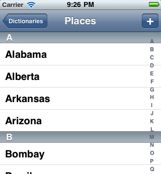 When you're using a UITableView and you define the UITableViewDataSource method -sectionIndexTitlesForTableView:, you get a sweet right-hand-side view for scrubbing through a long table view of fields, separated by sections. The titles are the names of the sections, by default (or at least letters based on the section names).