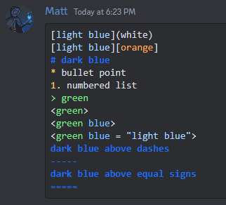 There are many different languages in place of Markdown that Discord's syntax highlighting support. Each different language has its own approach to highlight-able syntax. Note that you won't be able to view syntax highlighting on the mobile app.