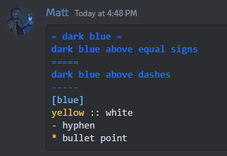 There are many different languages in place of Markdown that Discord's syntax highlighting support. Each different language has its own approach to highlight-able syntax. Note that you won't be able to view syntax highlighting on the mobile app.
