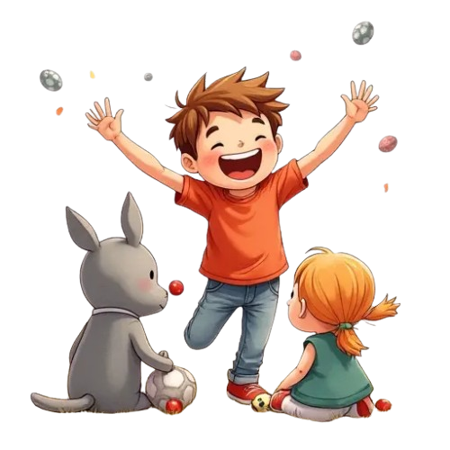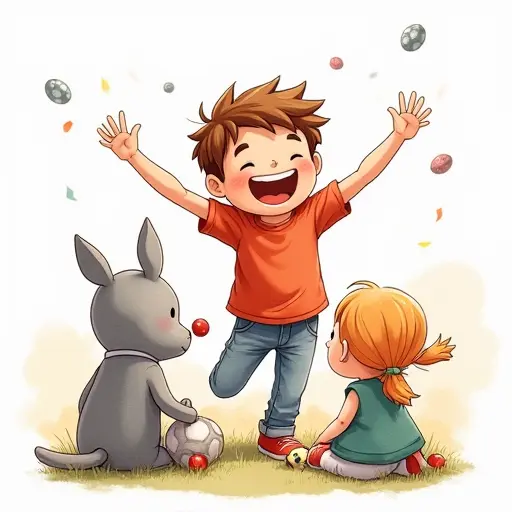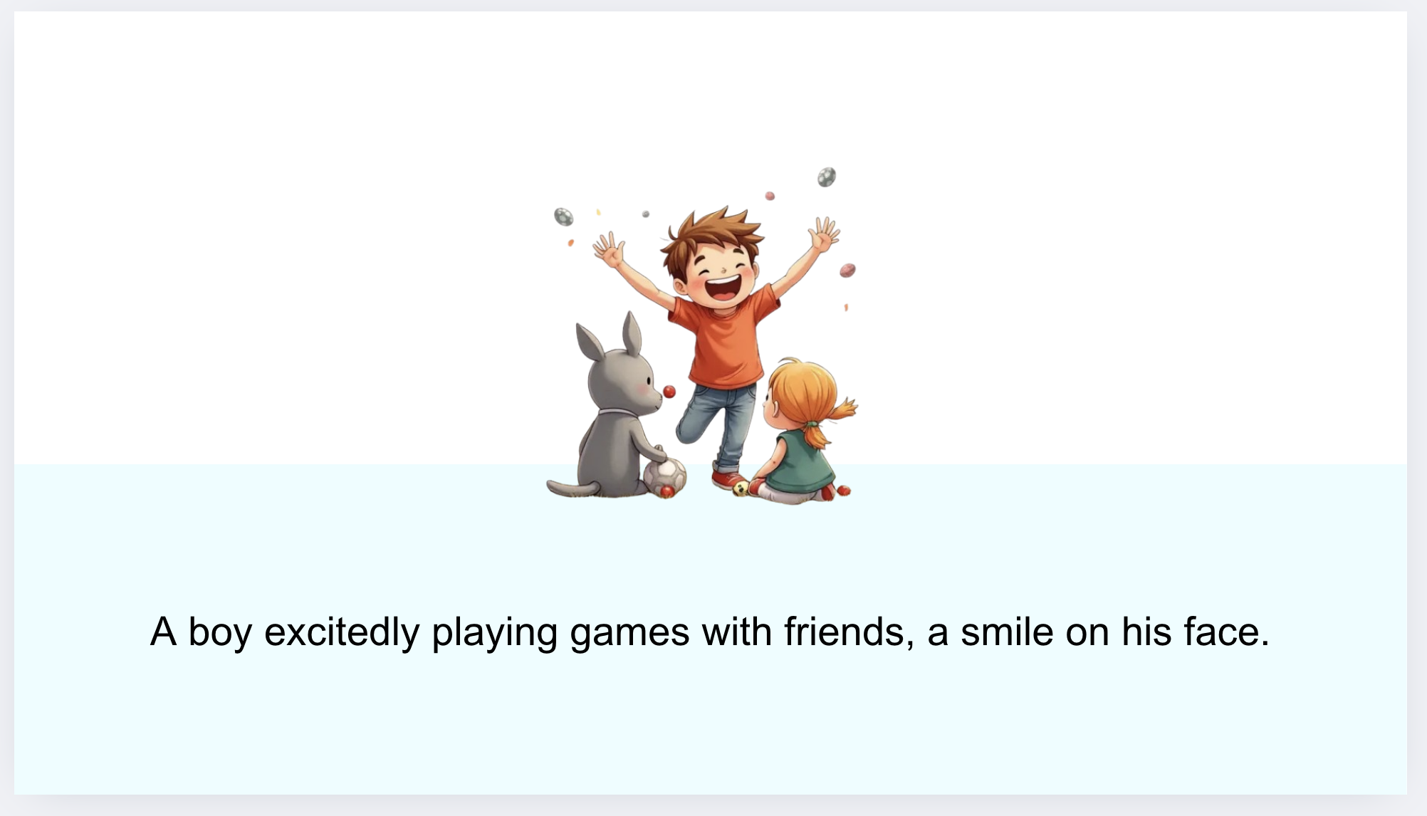 - Open storytoimage and enter an image description, such as: A boy excitedly playing games with friends, a smile on his face.