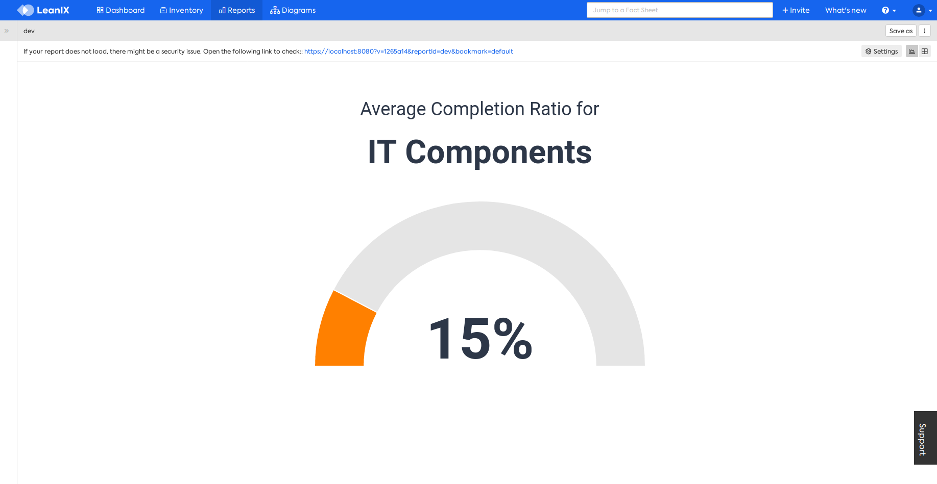 In this step-by-step tutorial we create a simple LeanIX custom report that demonstrates how to integrate a third party library for visualizing workspace data. More specifically, we'll display on a half-pie chart the average completion ratio for a specific factsheet type, configurable by the user, as in the picture below.