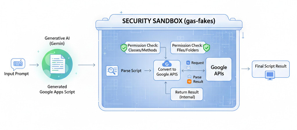 While amazed by this vast project, I realized its potential application to an idea I had previously attempted but failed to achieve: "a secure sandbox for Google Apps Script." Through discussions with Bruce, I became convinced that this GAS sandbox was feasible. Although generative AI had not yet emerged at the time I attempted it before, we now live in an era where AI automatically generates scripts. For many users, ensuring a safe environment to execute AI-generated GAS is critically important. GAS services sometimes require broad permissions, such as access to a user's entire Google Drive, posing a significant risk when running code from untrusted sources. I was confident that using gas-fakes as a sandbox would be a powerful solution to this security challenge by enabling fine-grained control, such as restricting script access to specific files only.