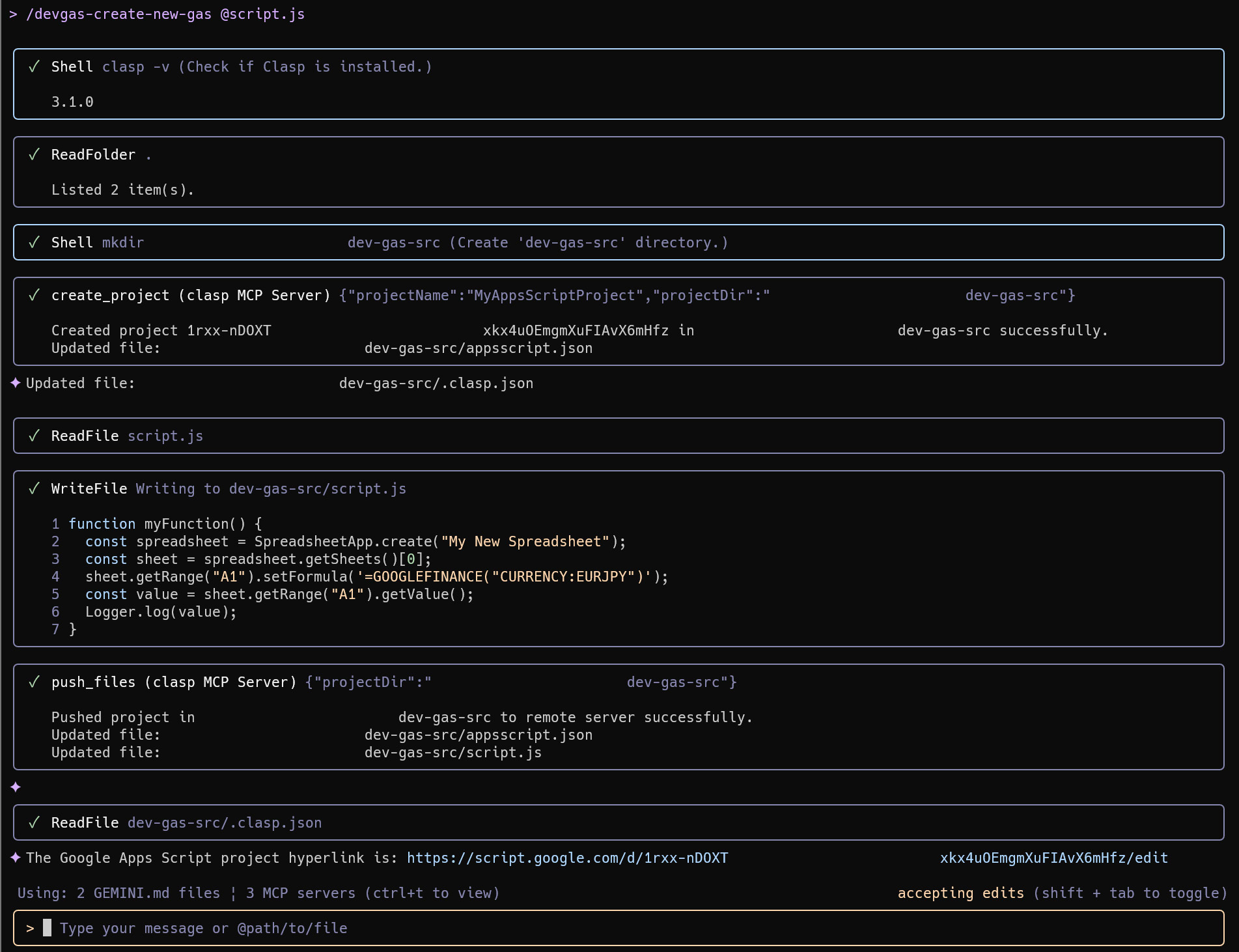 gemini extensions install https://github.com/tanaikech/gas-development-kit-extensionThis extension is lightweight, as it does not include the scripts for the Clasp and gas-fakes MCP servers, which are already implemented in their respective tools.