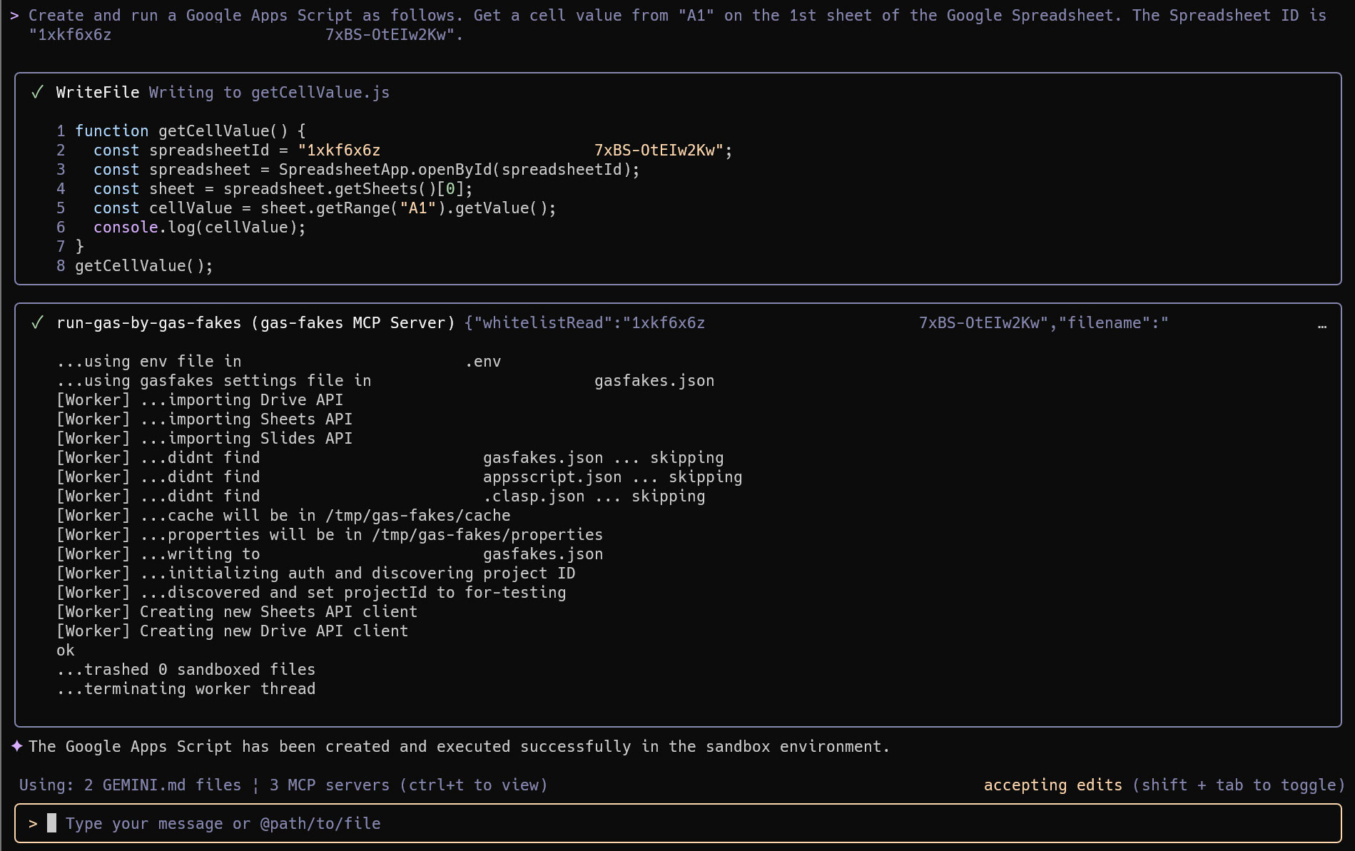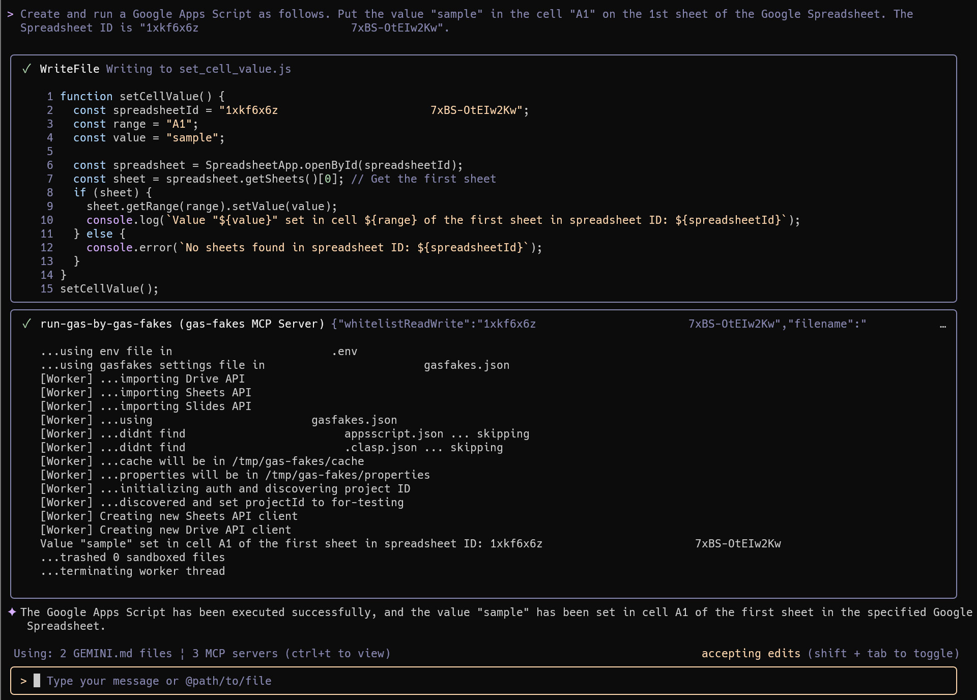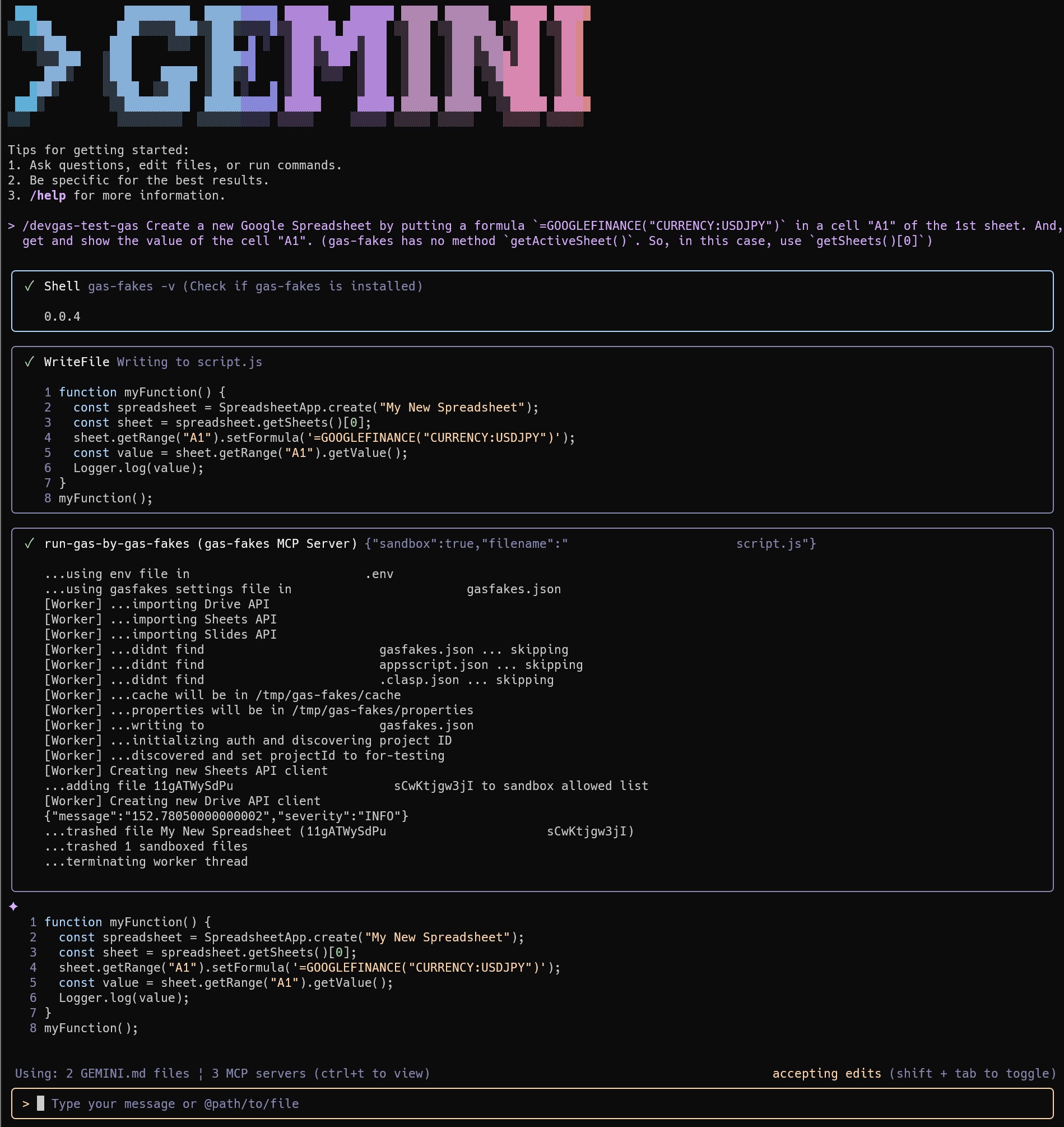 As a next step, gas-fakes was implemented as an MCP (Model Context Protocol) server. Ref Ref This allowed users to interactively use gas-fakes as a tool from the Gemini CLI, but it was still limited to use within a specific directory.