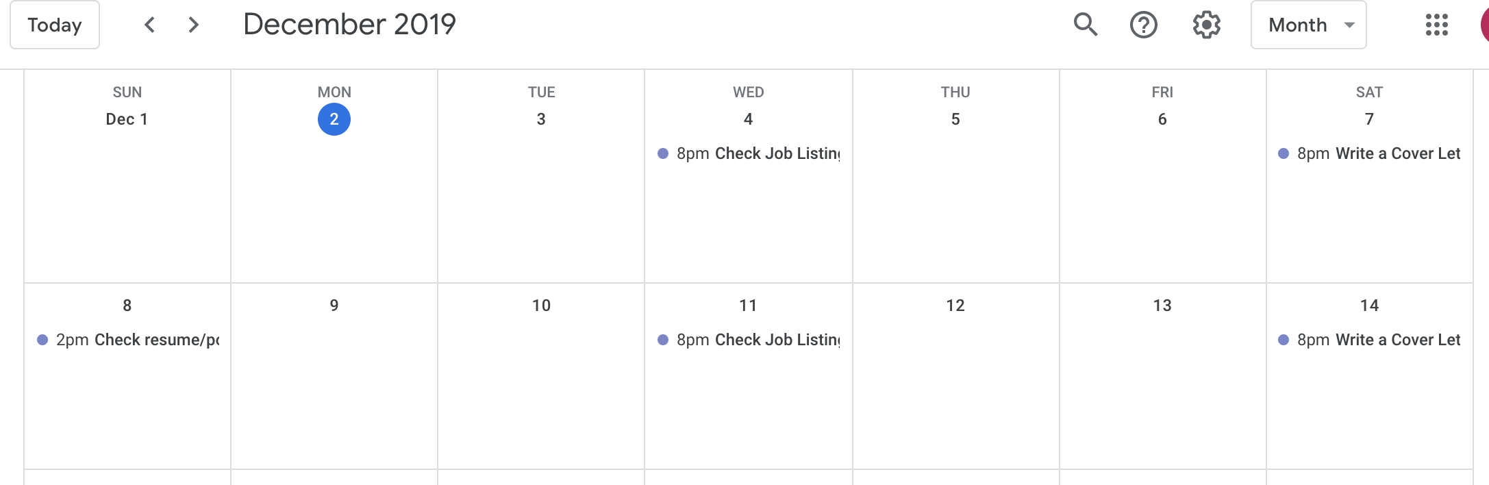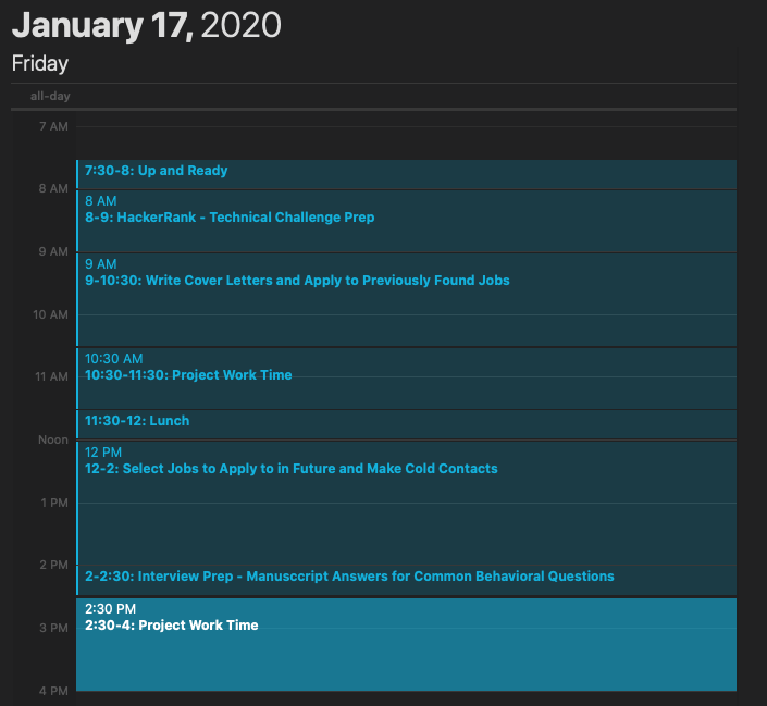 - Wednesday 8:00pm - Check job listings and choose (at least) 1 to apply for. Begin company research and look for an outreach opportunity. Write outreach email if applicable.