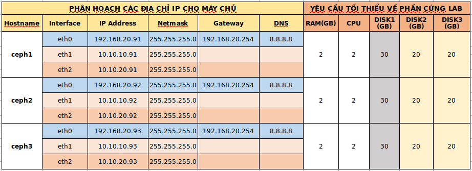/etc/hostsđể phân giải từ IP sang hostname và ngược lại, nội dung như sau127.0.0.1 localhost 127.0.1.1 ceph1 10.10.10.91 ceph1 10.10.10.92 ceph2 10.10.10.93 ceph3