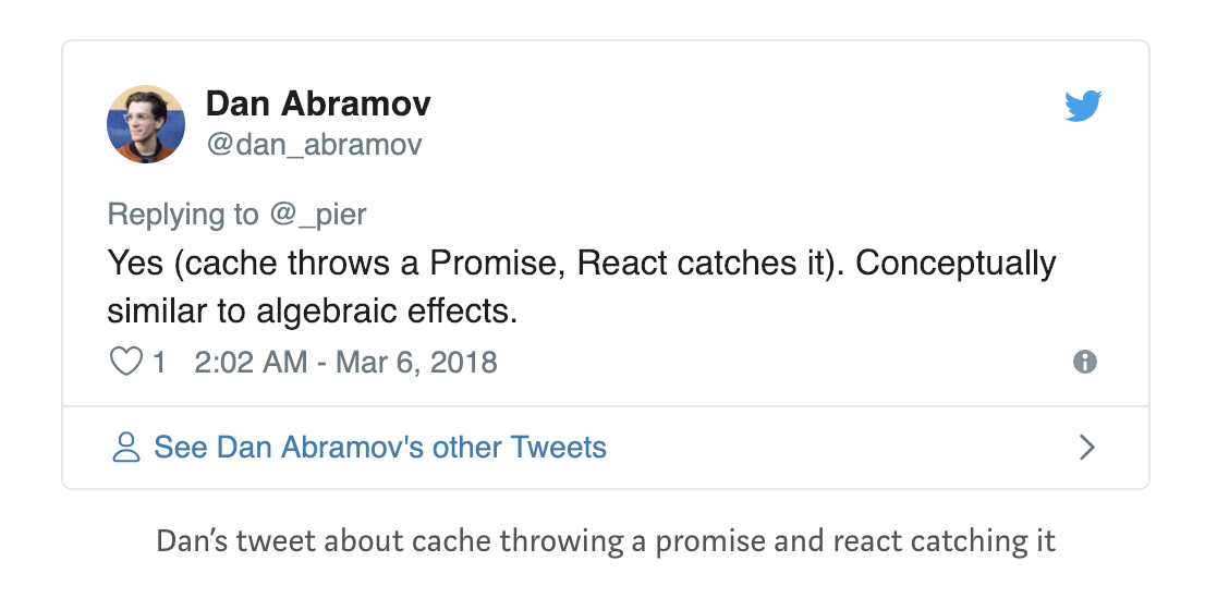 Dan Abramov in his talk “Beyond React 16” at JSConf Iceland 2018 said: