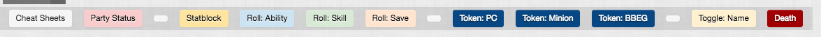 Remember to add /w gm or @{selected|wtype} to hide sensitive info from your players. WTYPE is an attribute used in the 5th Edition OGL character sheet, a prerequisite for most of these.