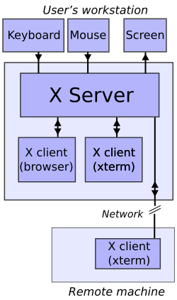 Let's start with the basics of how X Window System works. X uses client-server model. An X server program runs on a computer with a graphical display and communicates with various client programs (X clients). The X server acts as a go-between for the user and the client programs, accepting requests for graphical output from the client programs and displaying them to the user (display), and receiving user input (keyboard, mouse) and transmitting it to the client programs.