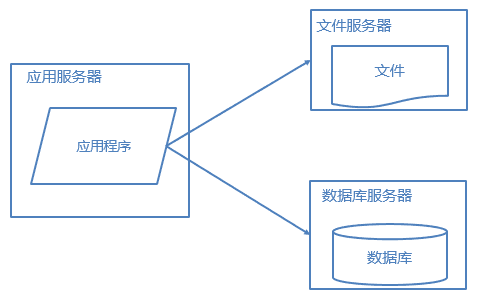 最初业务量不大,访问量小,此时的架构,应用程序、数据库、文件都部署在一台服务器上,有些甚至仅仅是租用主机空间。